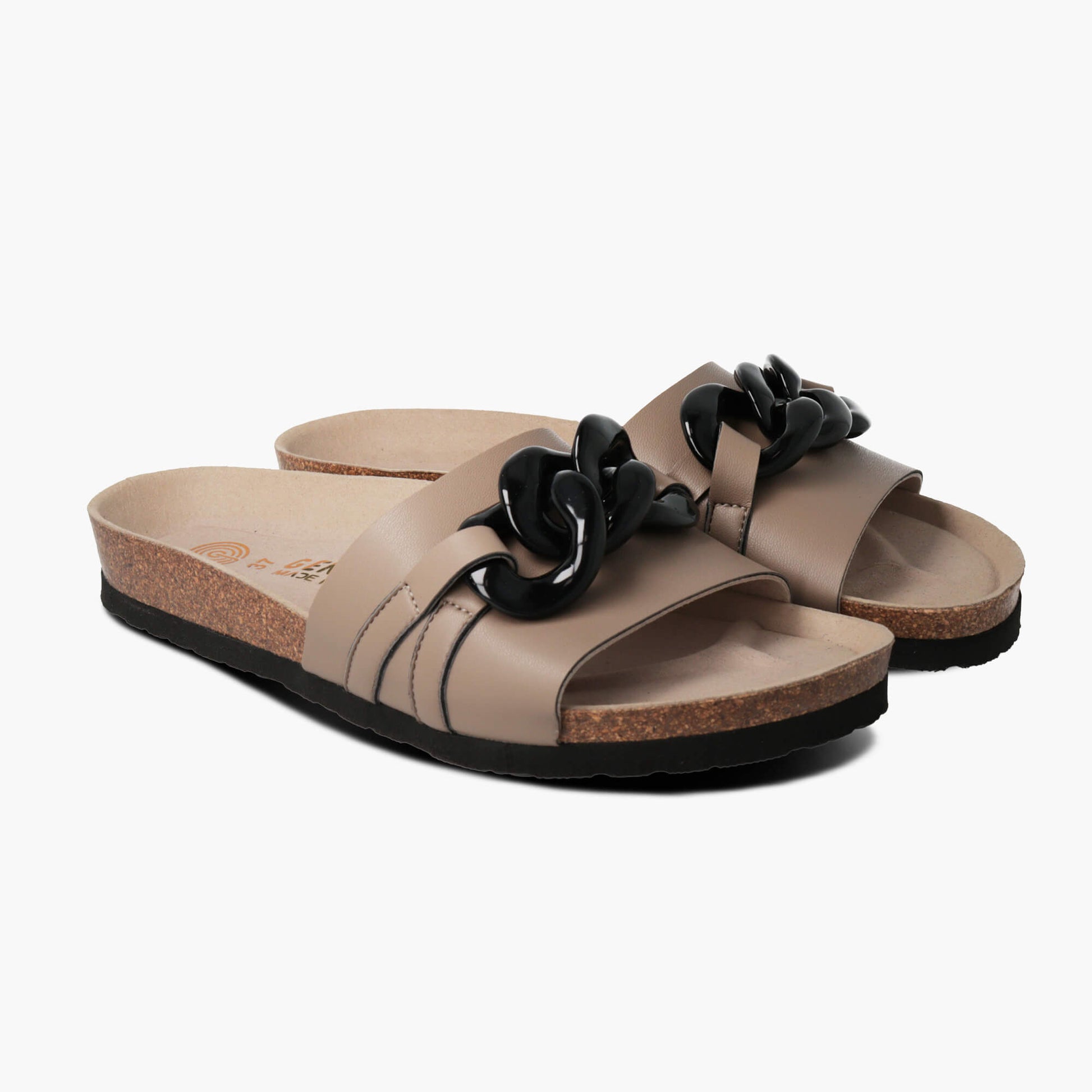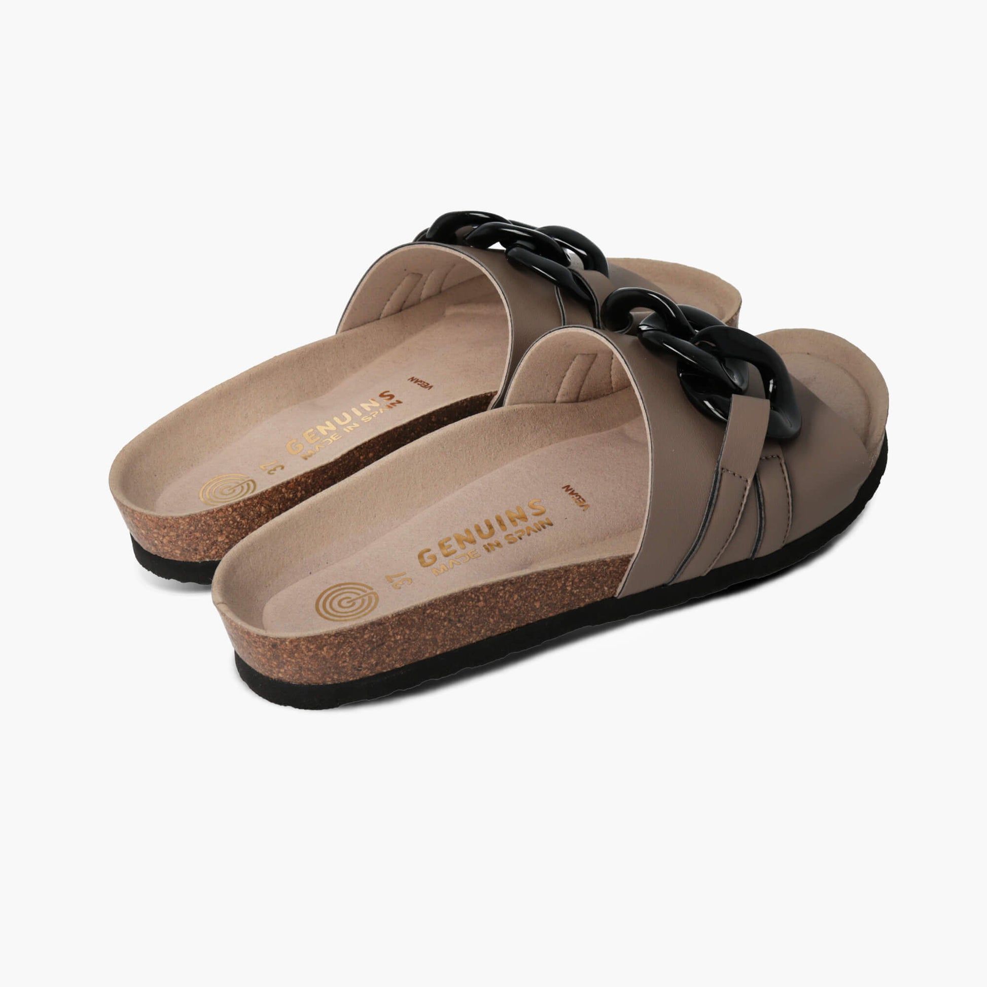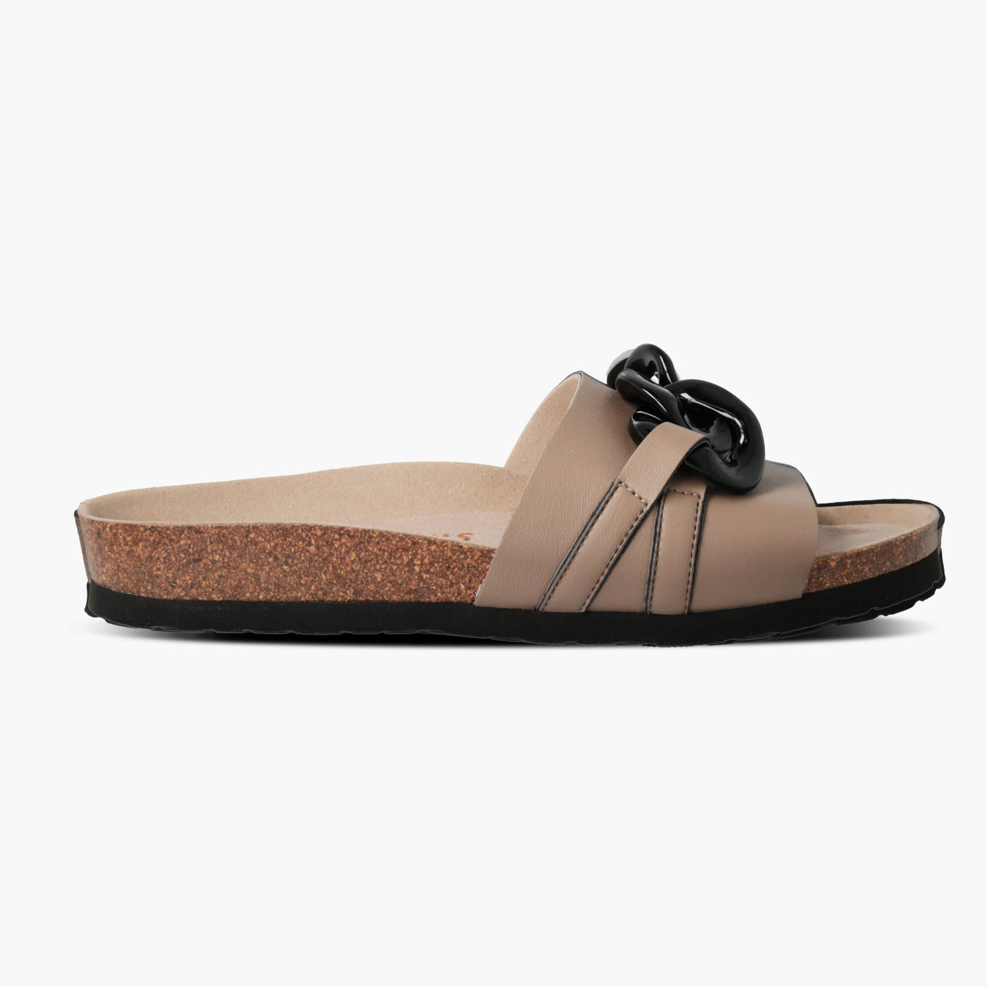 This vegan sandal is made from synthetic material and features a stylish chain on the top. Its comfortable anatomical insole is constructed with soft cork and covered in synthetic microfiber. The EVA outsole is durable and made in Spain using sustainable production and local suppliers.