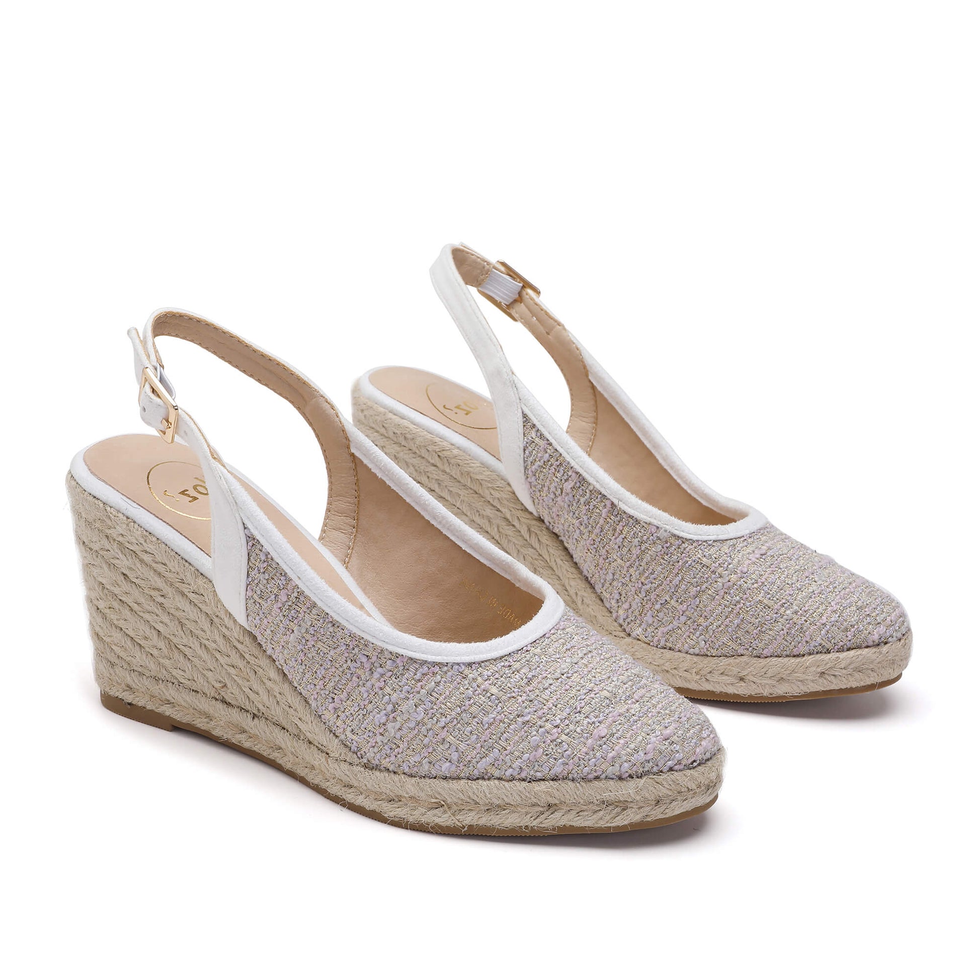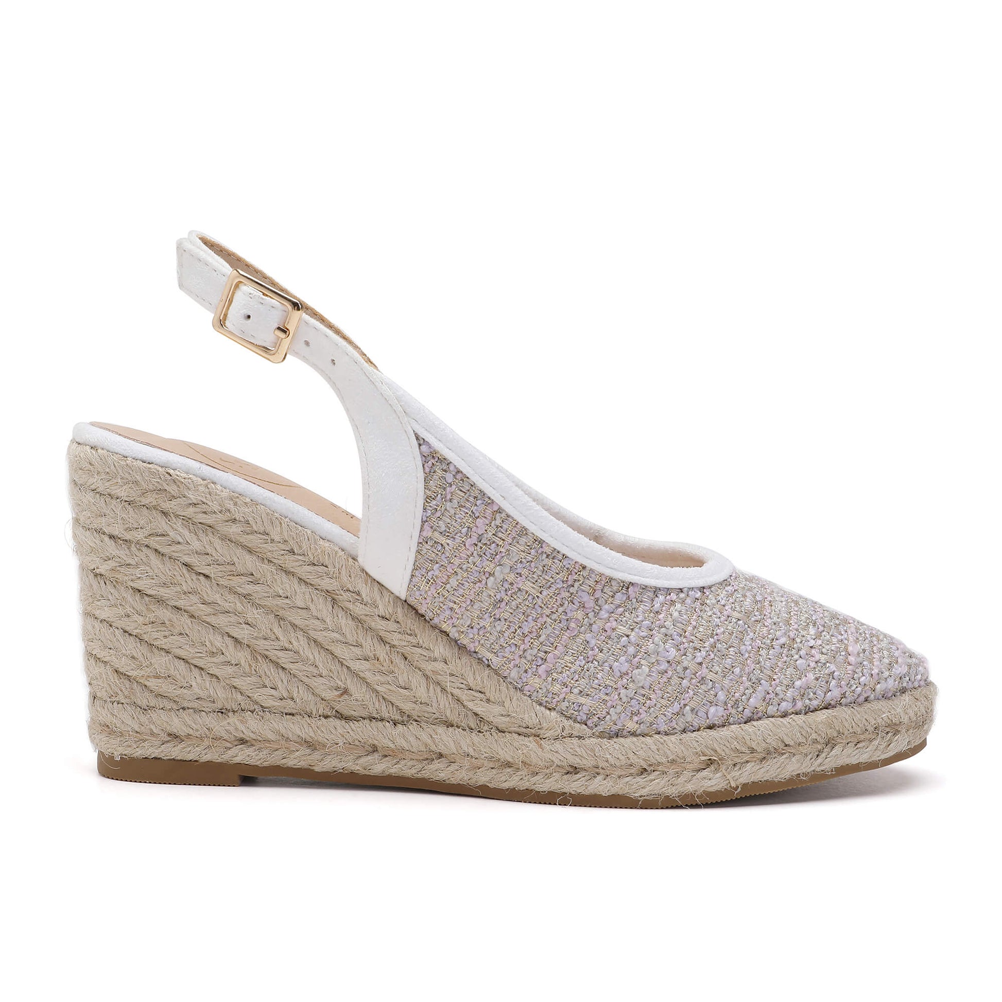 The Marilyn White & Purple Espadrille is a stylish and comfortable sandal perfect for summer days. Featuring a fabric upper, buckle ankle strap for an adjustable fit, and a 7cm heel for elevation, these espadrilles are guaranteed to provide all-day comfort. For an extra stylish touch, the sandal is trimmed with a beige robe. Step out in style with these gorgeous espadrilles!