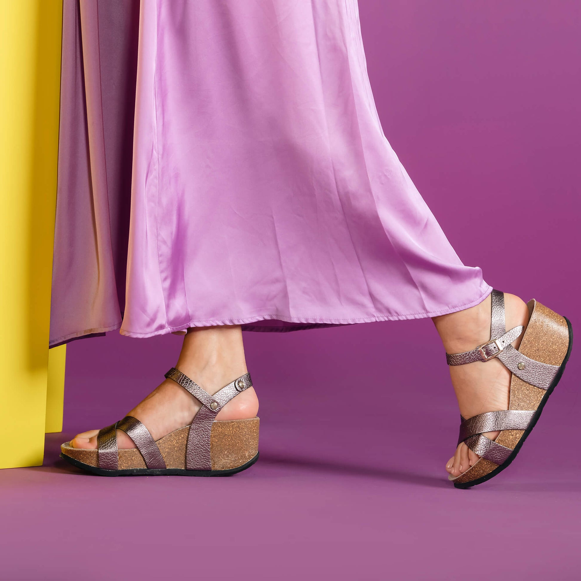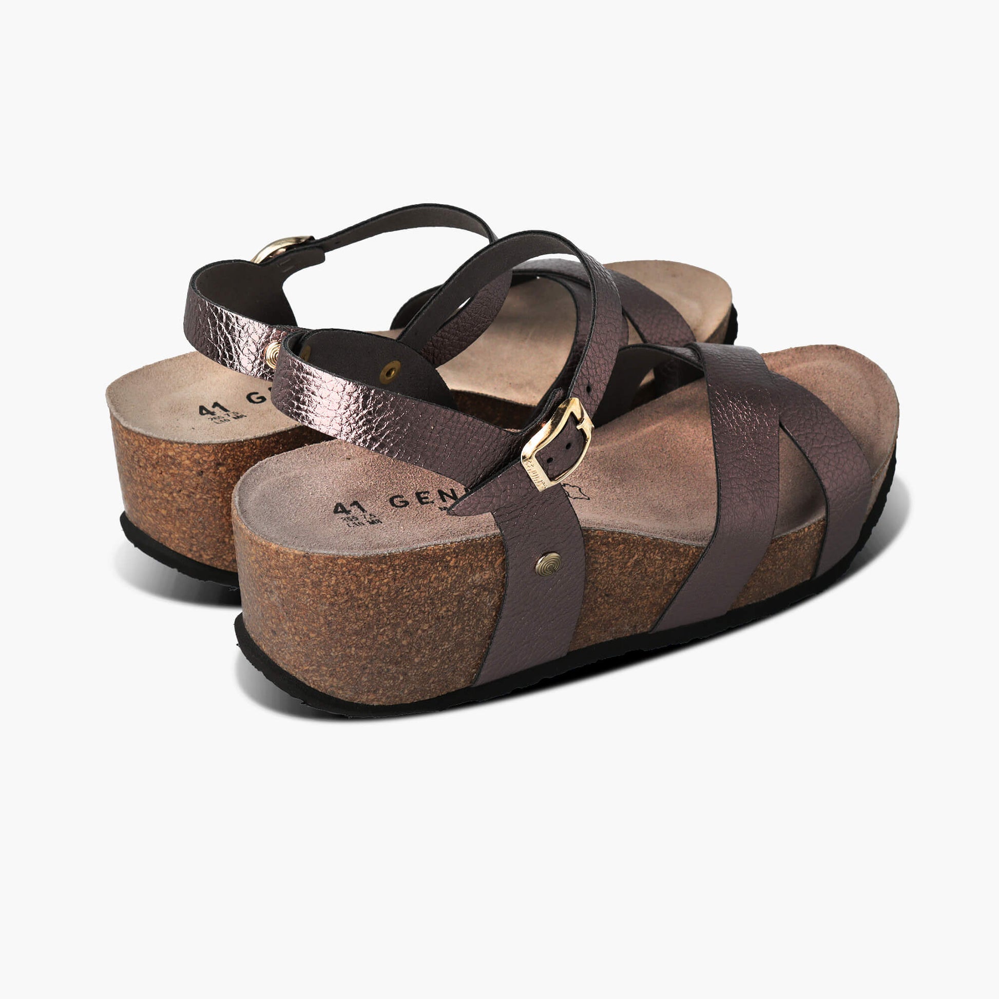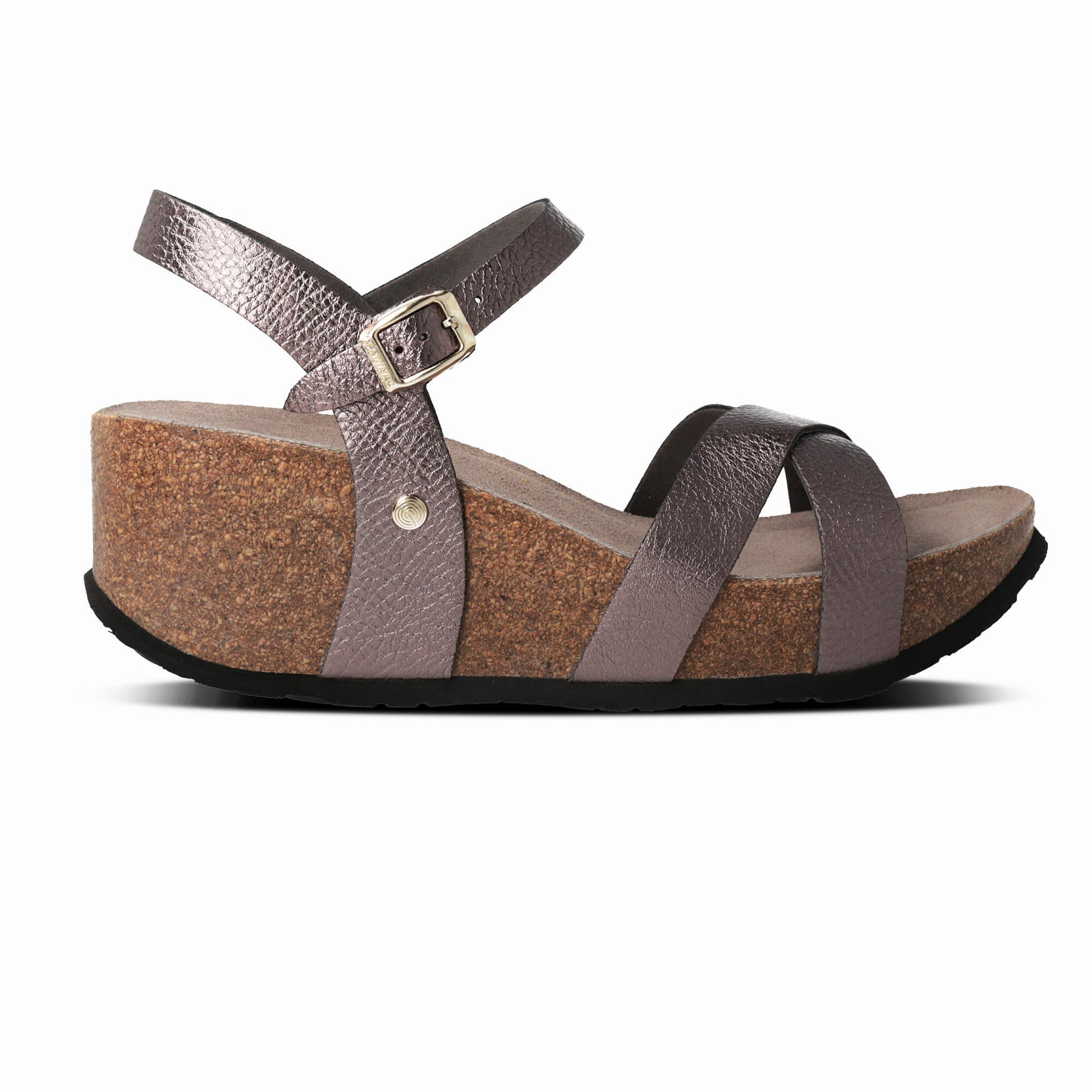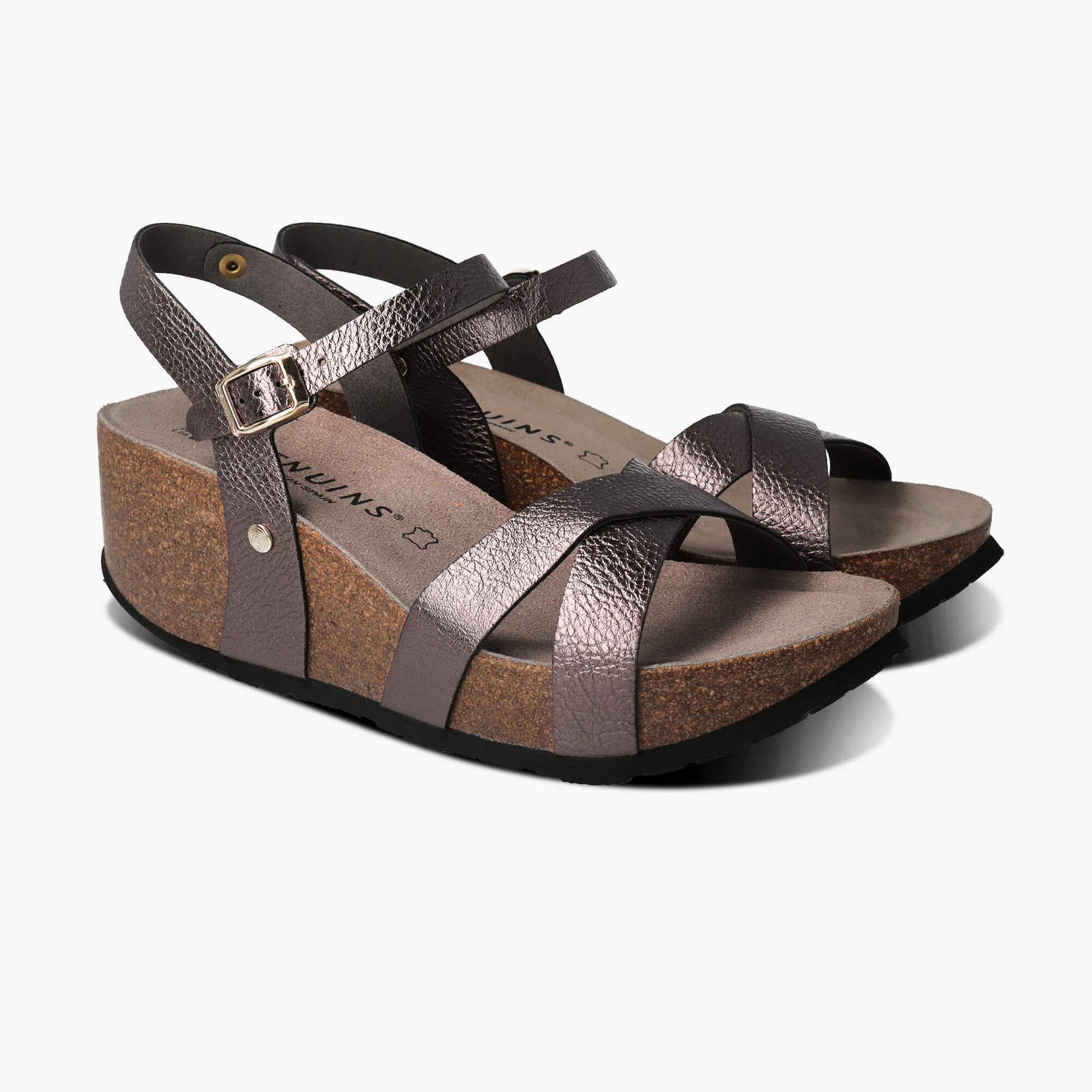 Leather uppers provide a secure fit for these sandals, fastened with a metal buckle around the ankle and in two crossed straps at the front. A 7 cm wedge heel at the back, anatomical cork footbed and EVA outsole combine for all-day comfort. Handcrafted in Spain.