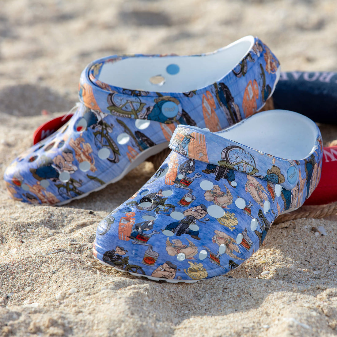 Woz stylish, lightweight and flexible clogs in Popeye Biker print. A must have for everyday...