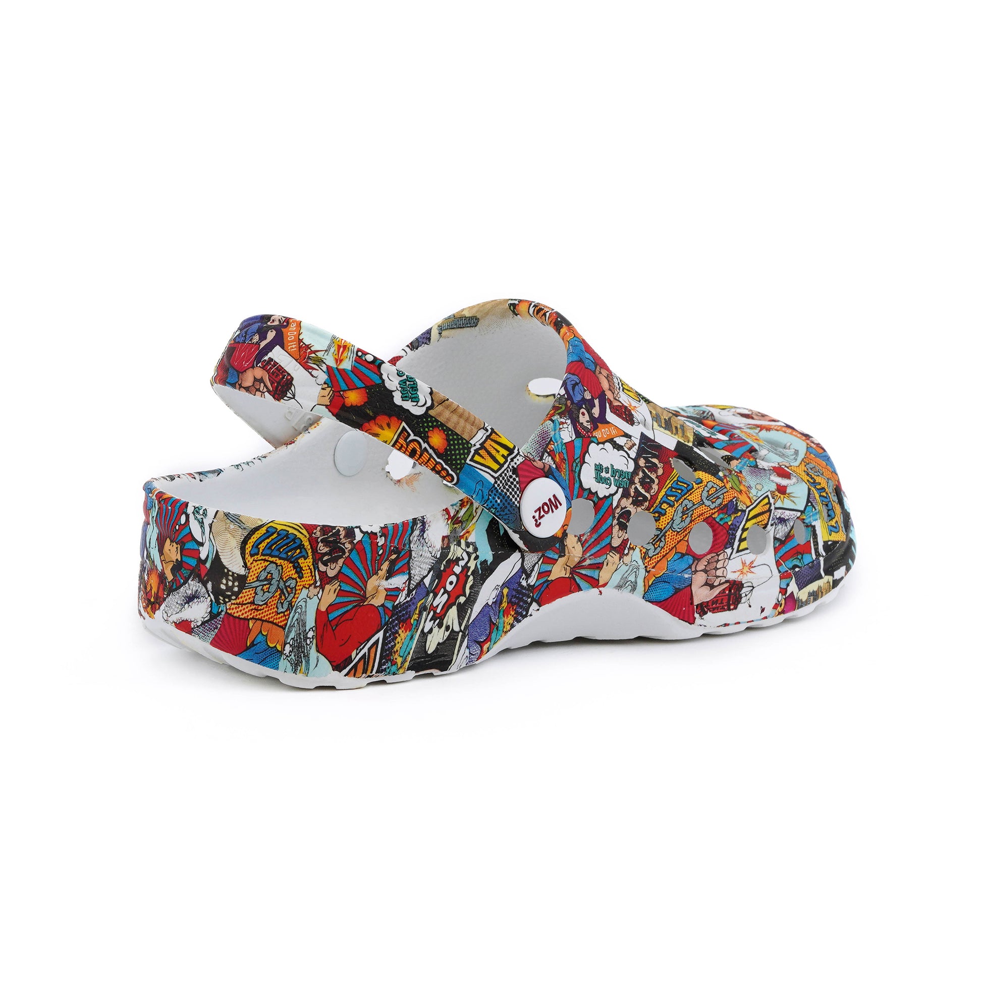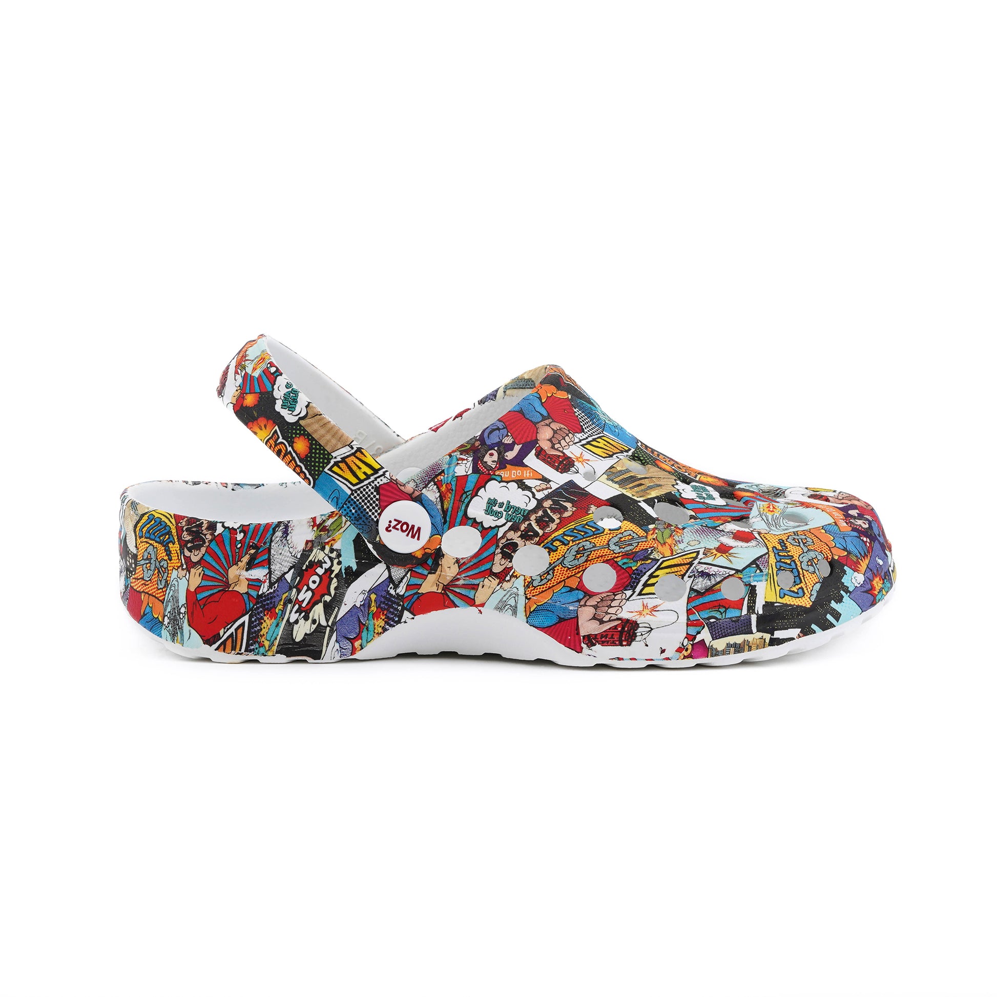 Stylish, lightweight and flexible clogs in pop comic print from Woz. A must have for everyday wear, comfortable with excellent grip. Easy to clean. Designed in Italy.