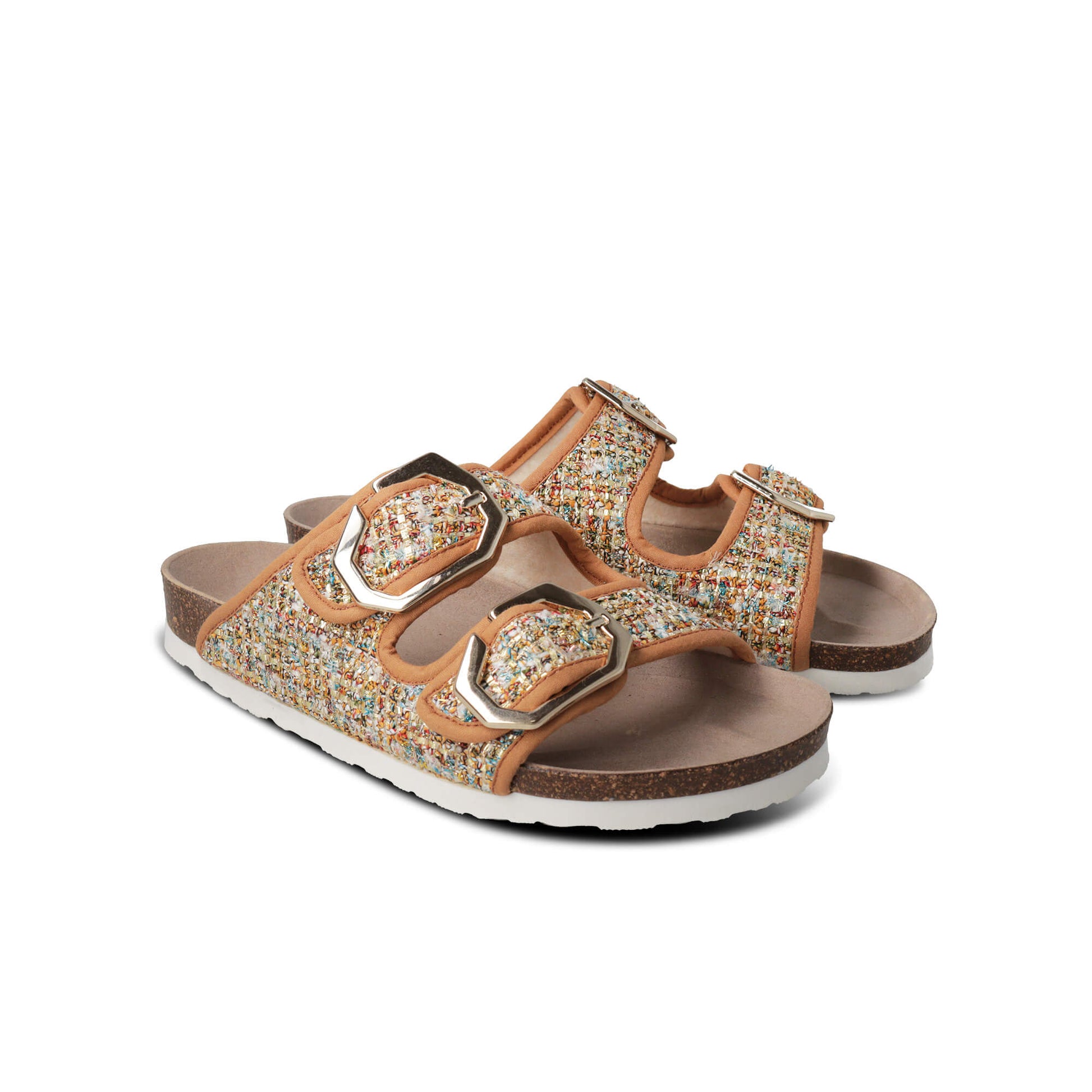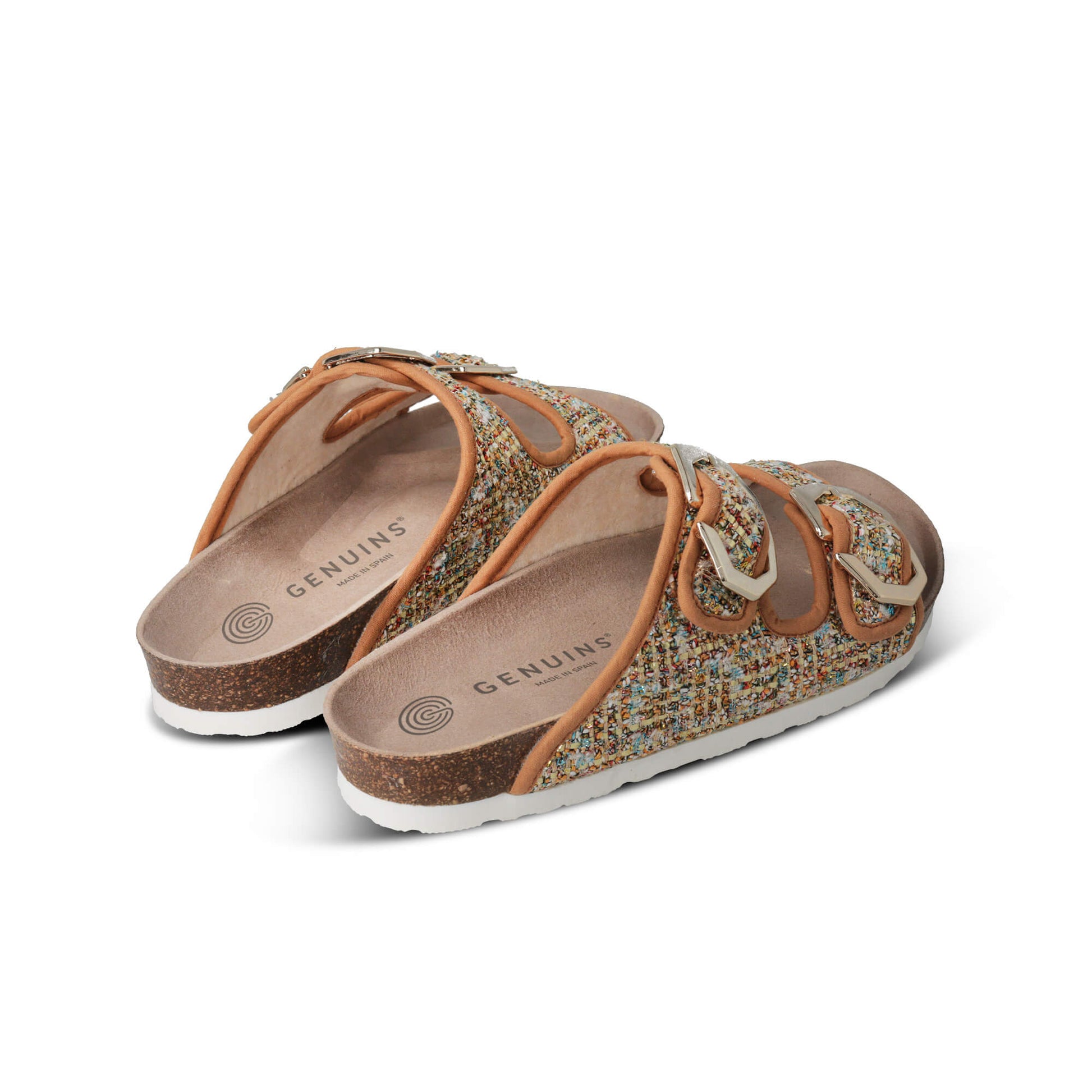 The Galia Caramel Sandal offers trendy style due to its fabric upper, secure fastenings with buckles, cushioned leather insole, anatomic cork insole, and lightweight EVA outsole. Expertly crafted in Spain, this sandal fuses modern design with outstanding comfort and prolonged durability.