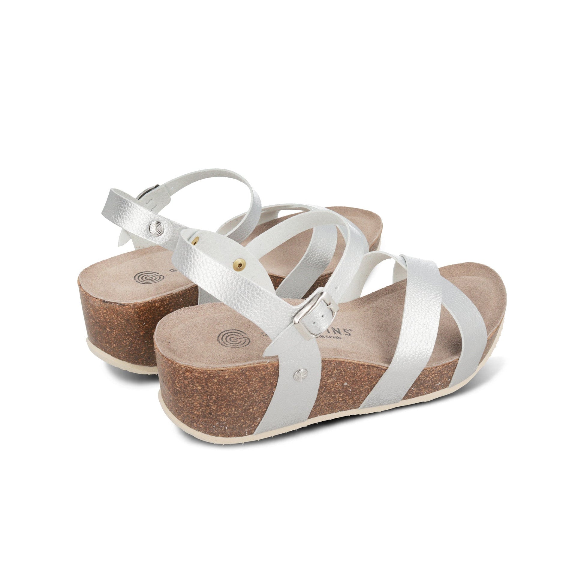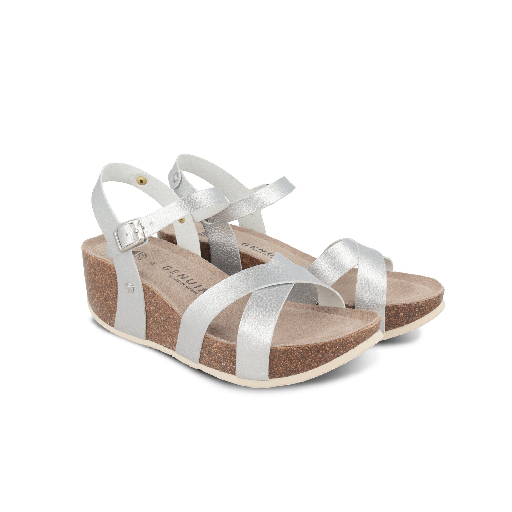 Leather uppers provide a secure fit for these sandals, fastened with a metal buckle around the ankle and in two crossed straps at the front. A 7 cm wedge heel at the back, anatomical cork footbed and EVA outsole combine for all-day comfort. Handcrafted in Spain.