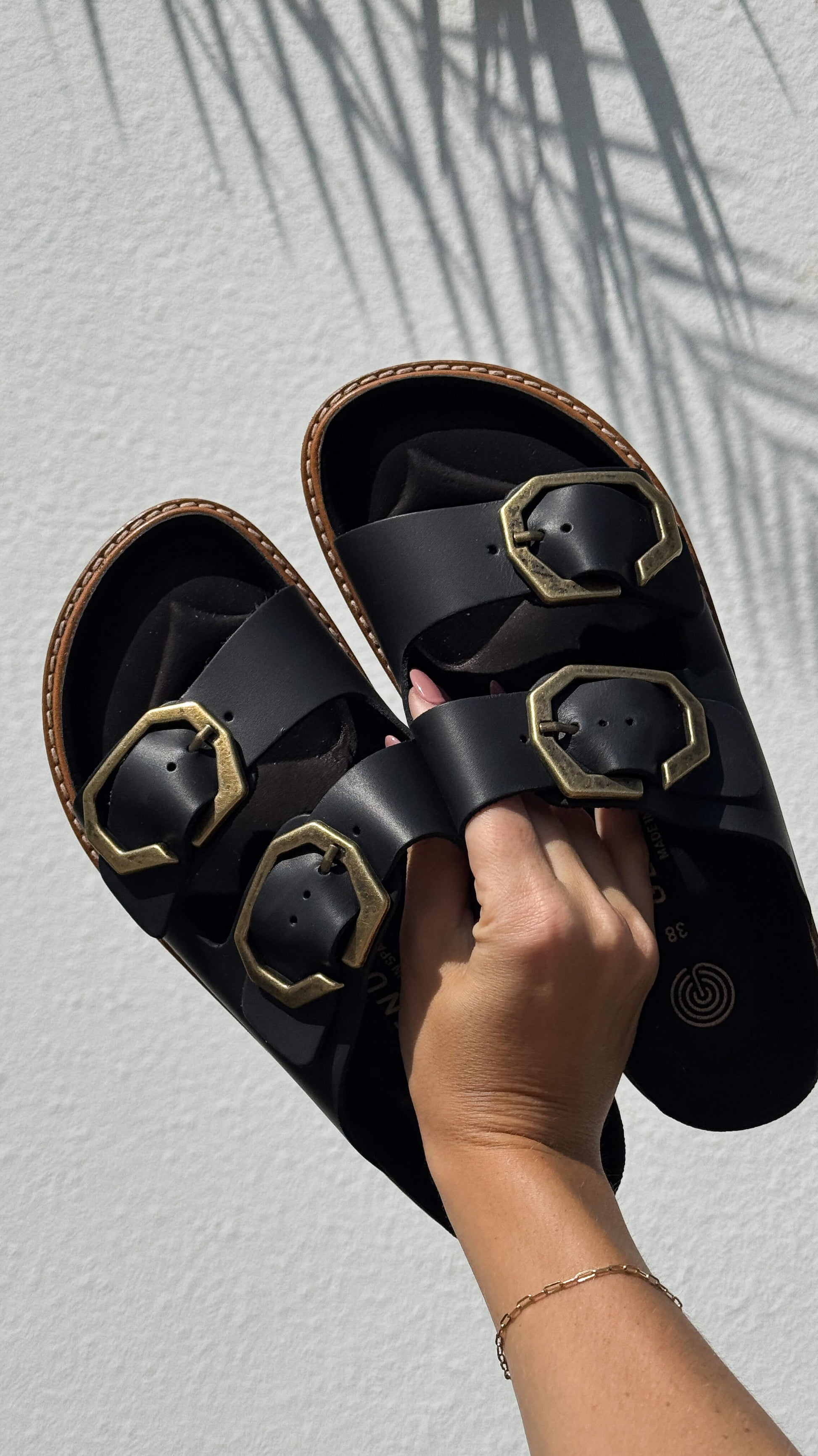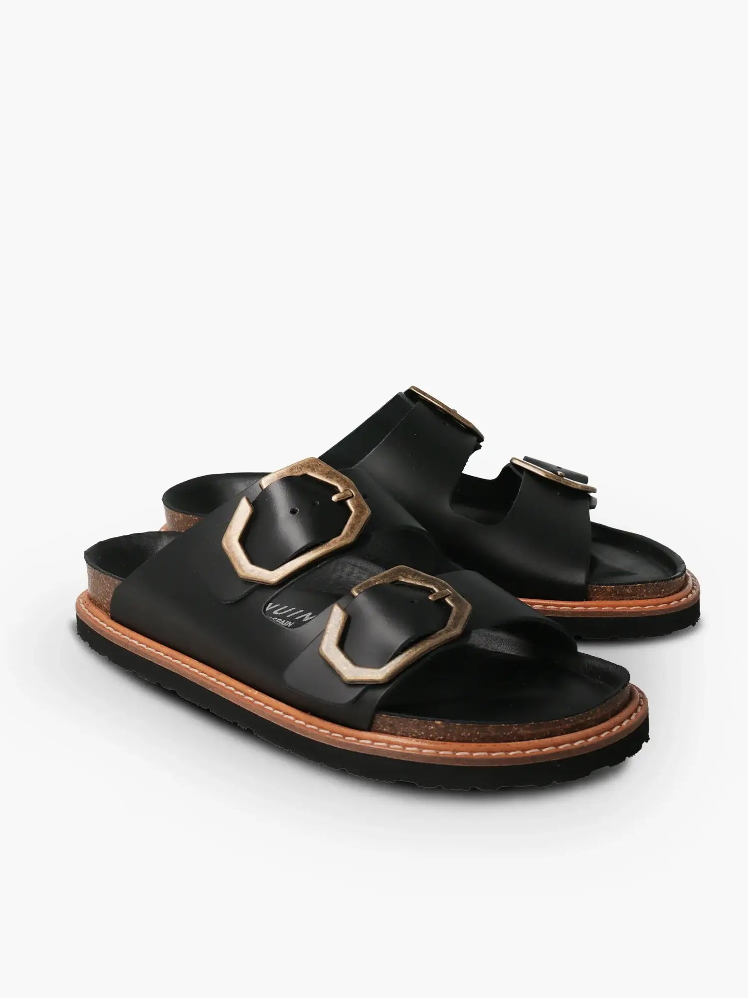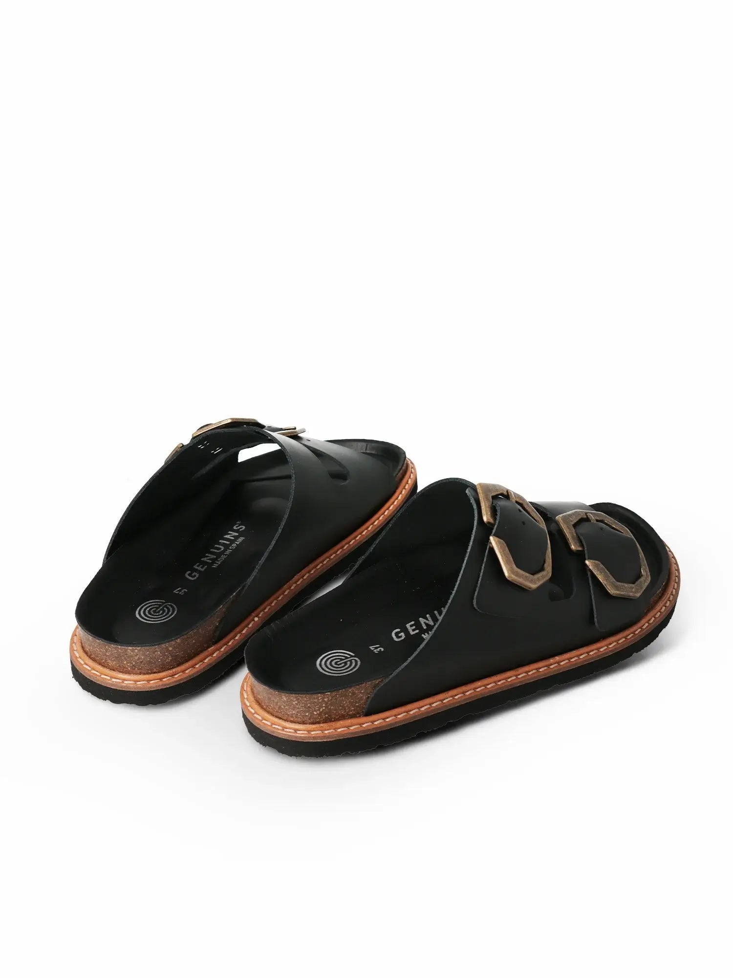Black leather sandal with anatomical cork and foam insole. Adjustable with our exclusive GENUINS buckle. Leather certified by suppliers of the Leather Working Group (LWG) with gold status. Designed and manufactured in our factories in Elche, under a sustainable production and local suppliers.