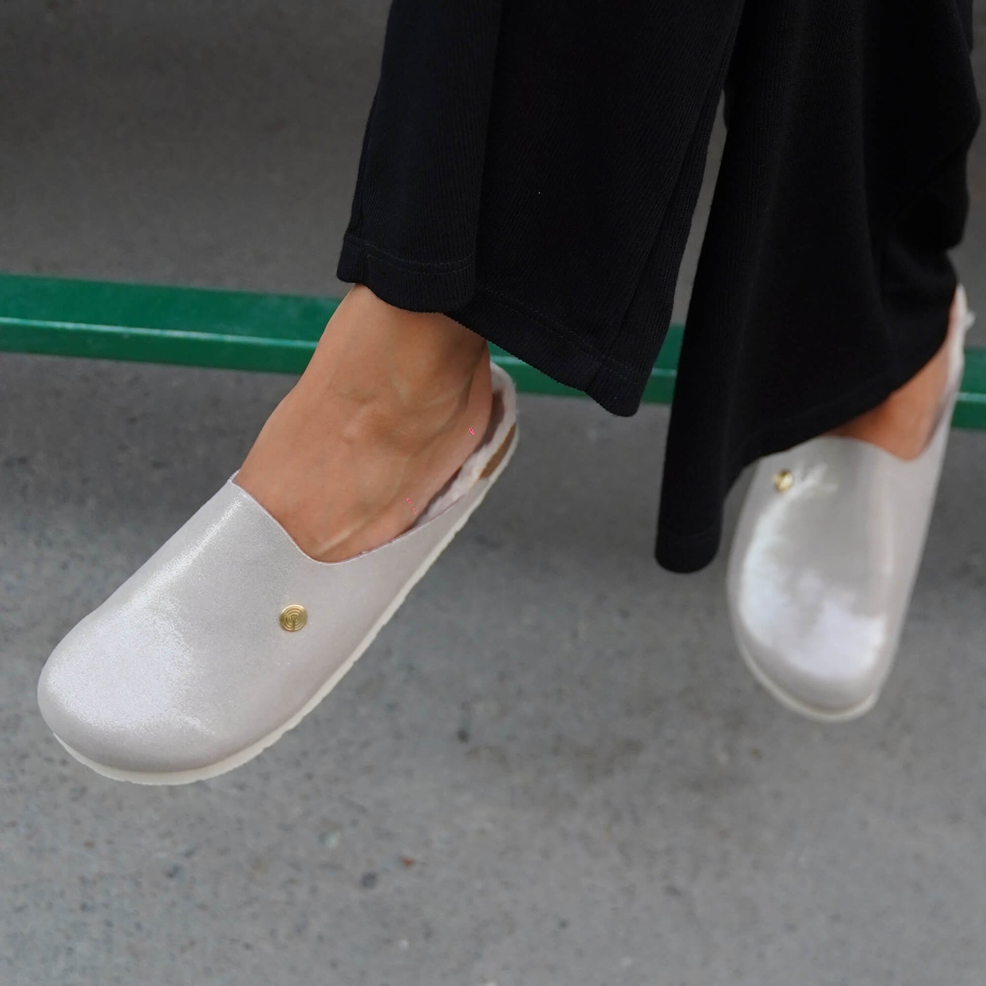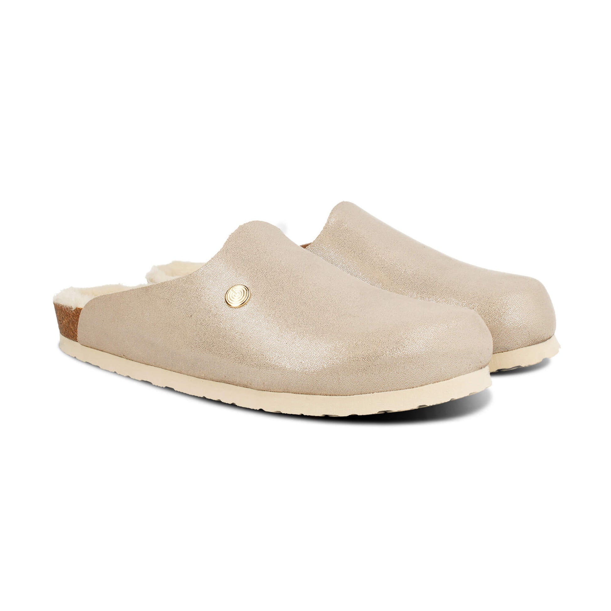 Made of natural cork and foam for greater comfort, covered with beige synthetic fur. Rubber outsole.