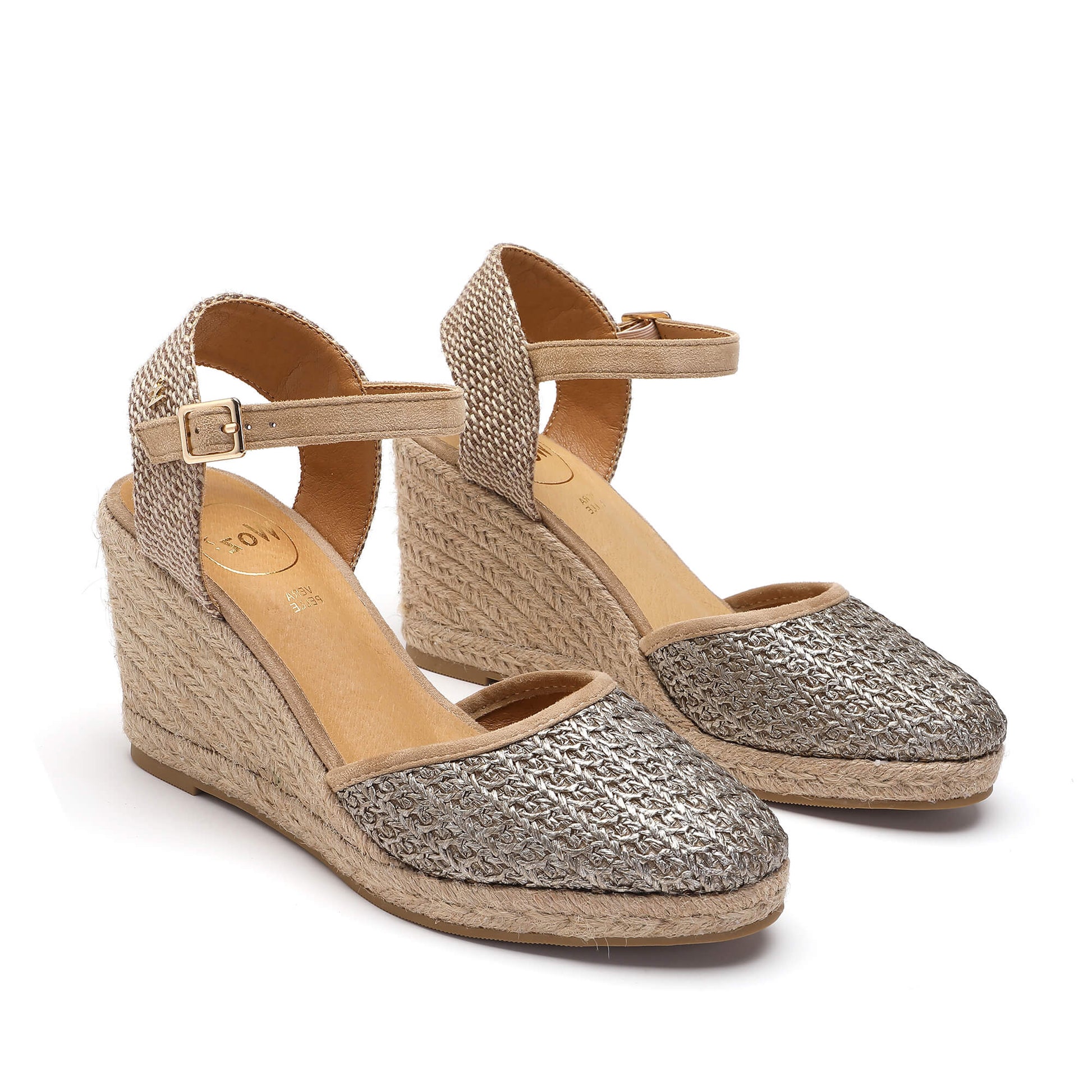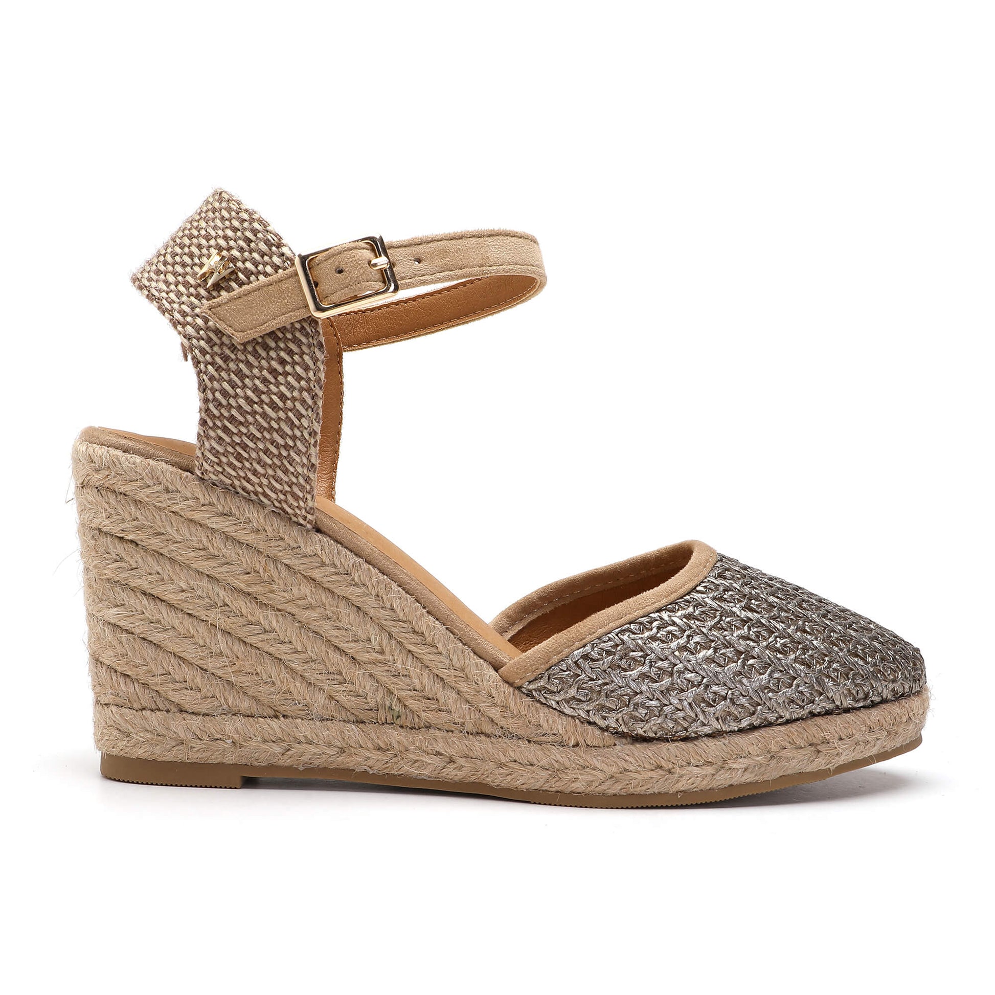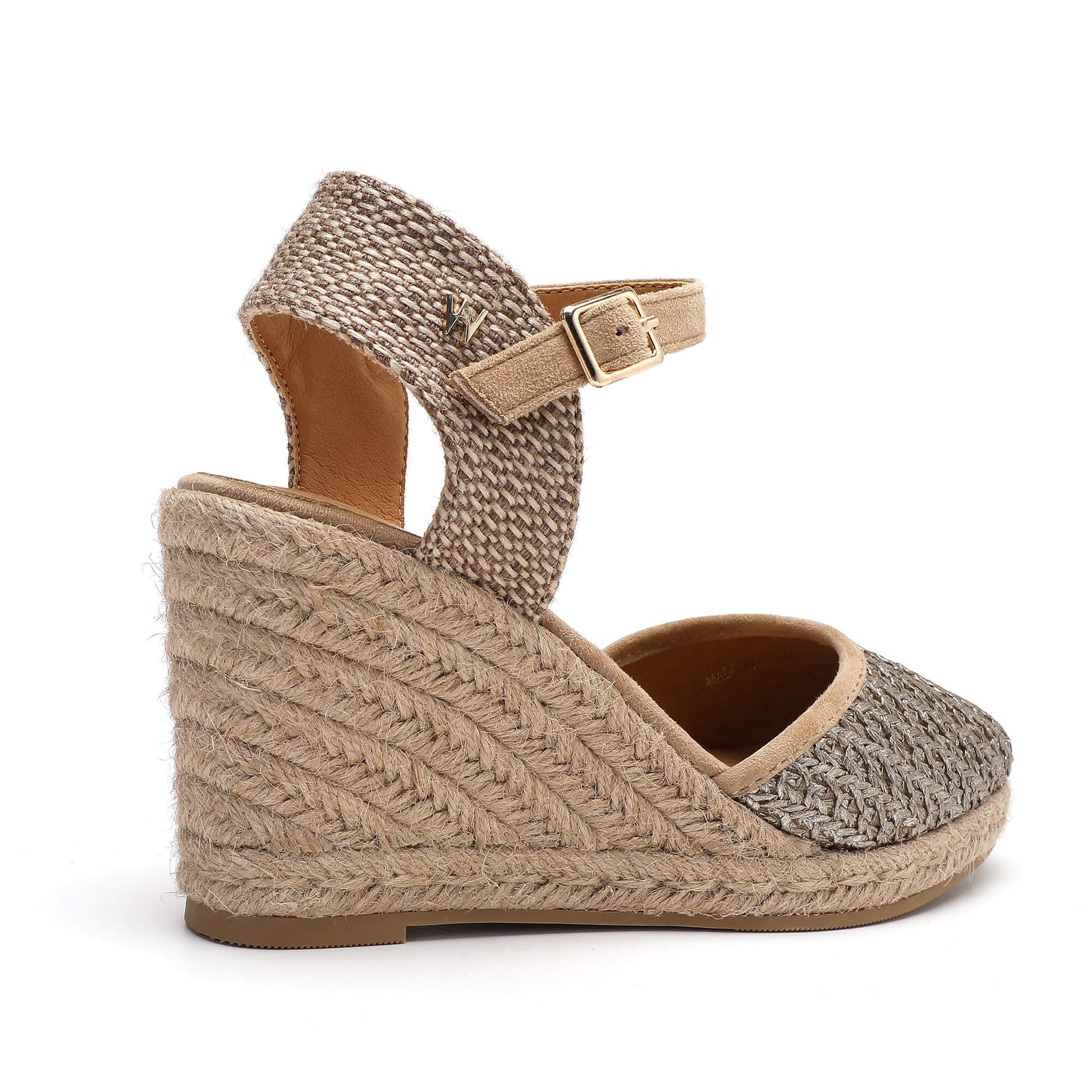 This stylish espadrille is crafted from raffia and features a buckle fastening ankle strap. The soft padded footbed and natural beige braided rope covering the heel make for a comfortable and trendy design. With a heel height of 7 cm, this shoe was expertly designed in Italy.