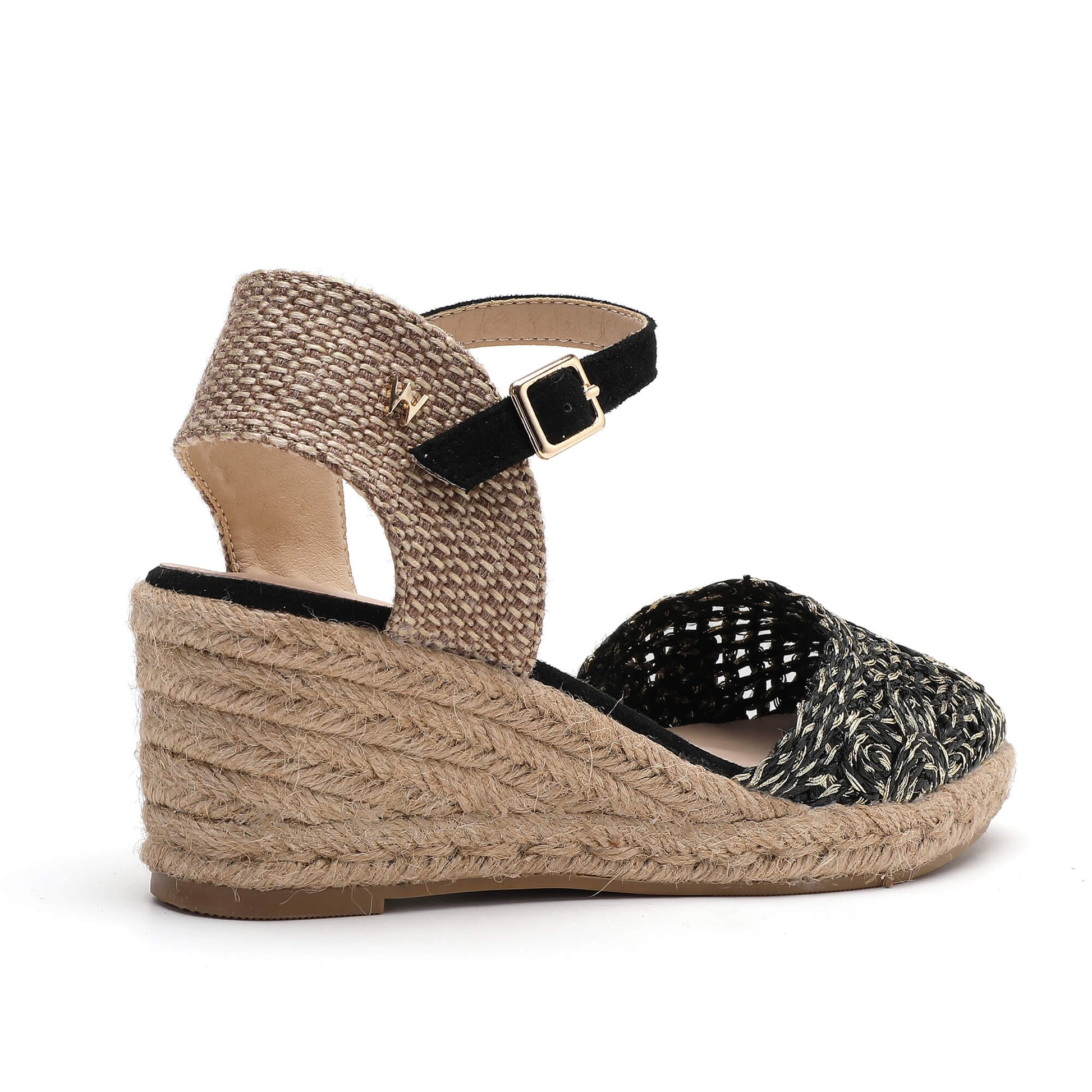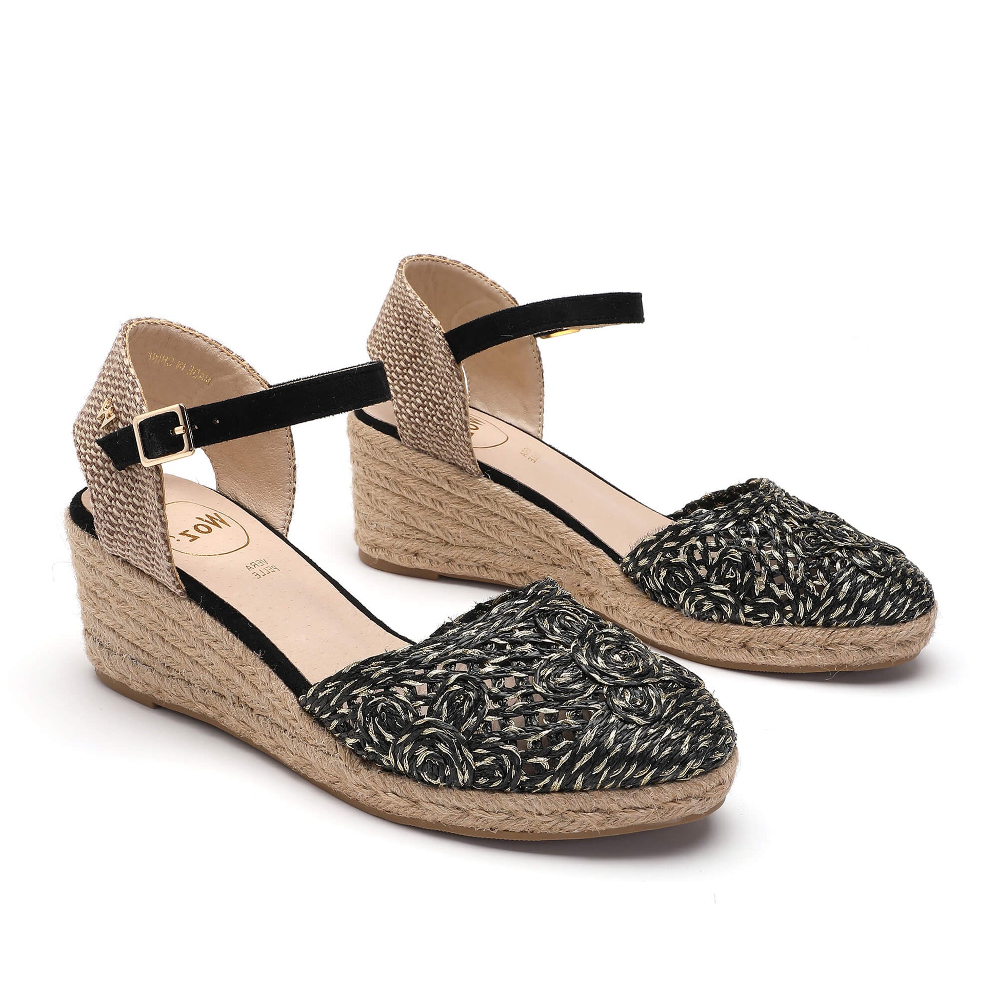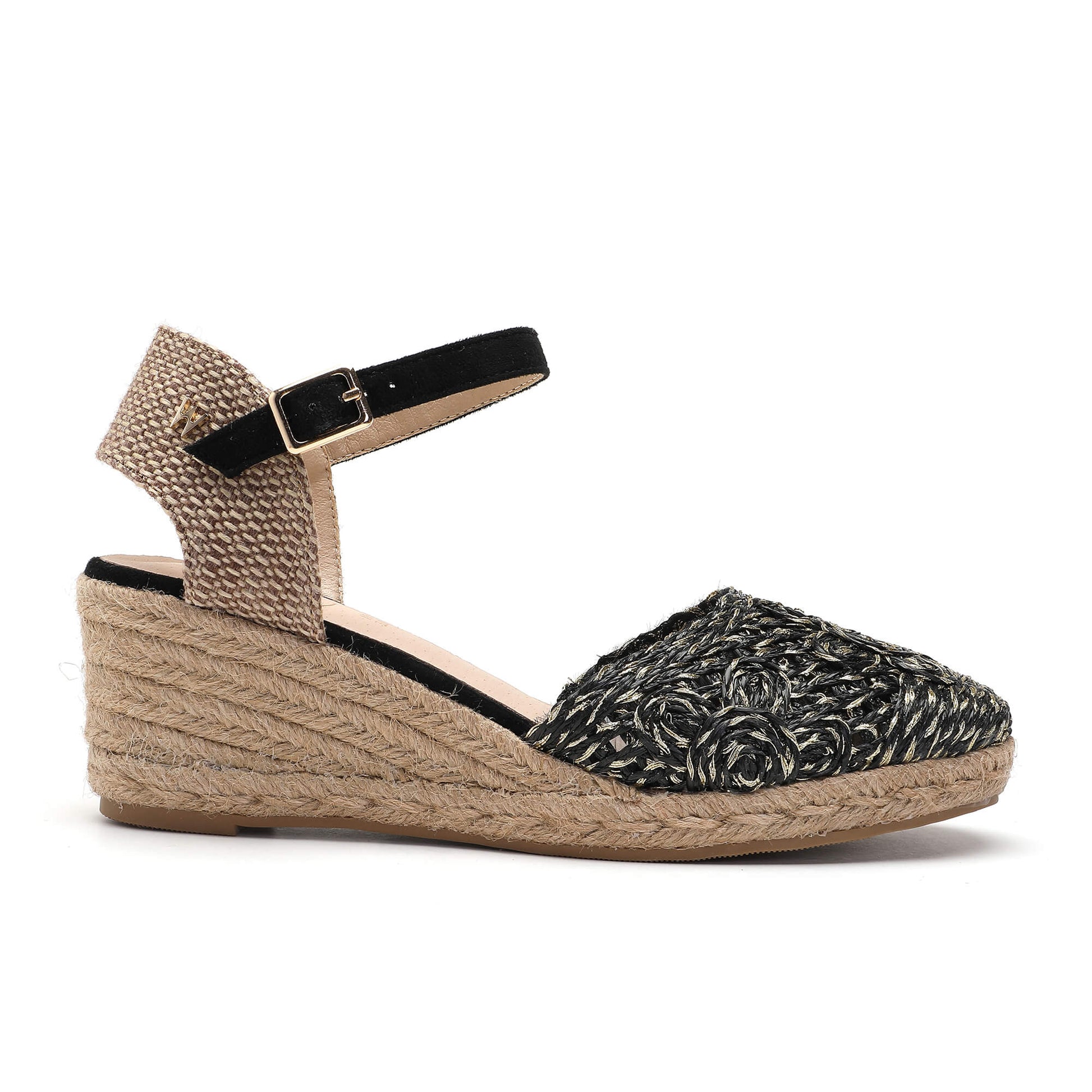 Constructed from a raffia upper, these Kelly Black Espadrilles feature a sophisticated mid high heel. With a buckle fastening ankle strap and a soft padded footbed, these espadrilles are both stylish and comfortable. The heel is covered in a natural beige braided rope, giving it a unique look. With a heel height of 5 cm, these espadrilles are designed to elevate any outfit. Designed in Italy with a focus on quality and style.