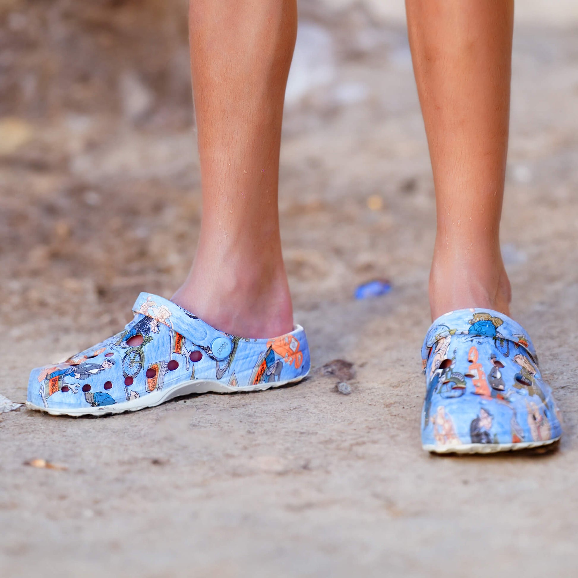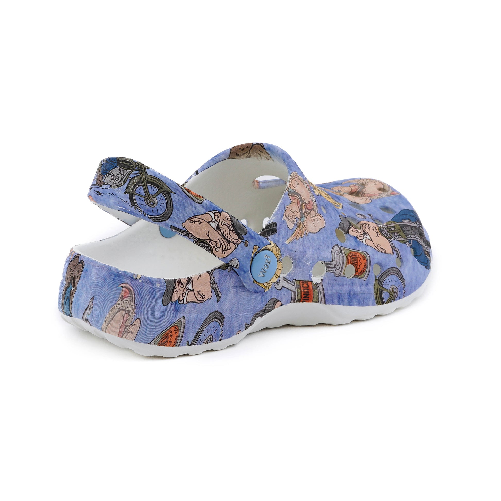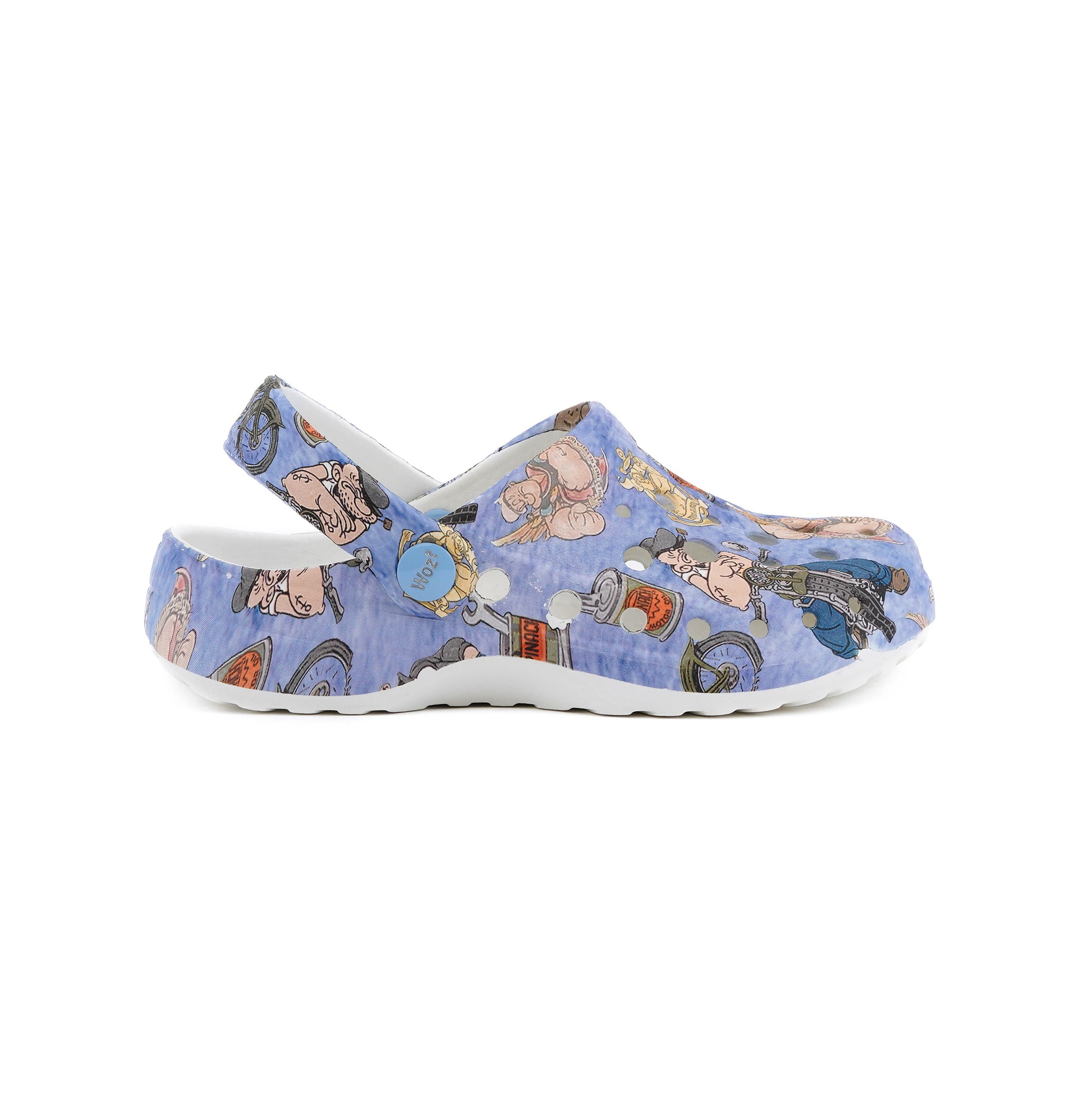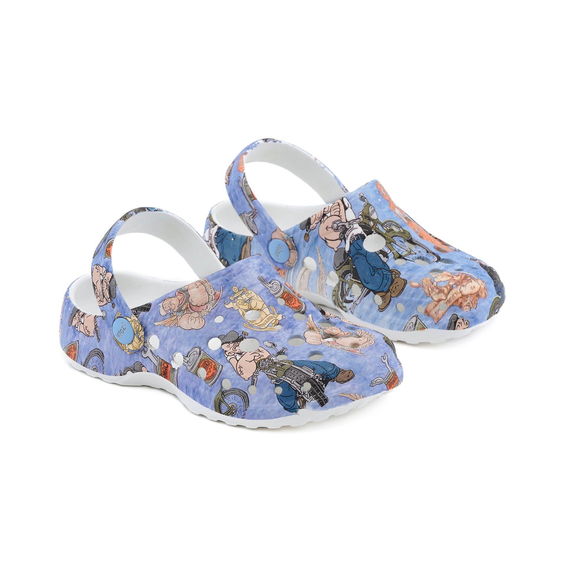 Woz stylish, lightweight and flexible clogs in Popeye Biker print. A must have for everyday wear, comfortable with excellent grip. Easy to clean. Designed in Italy.