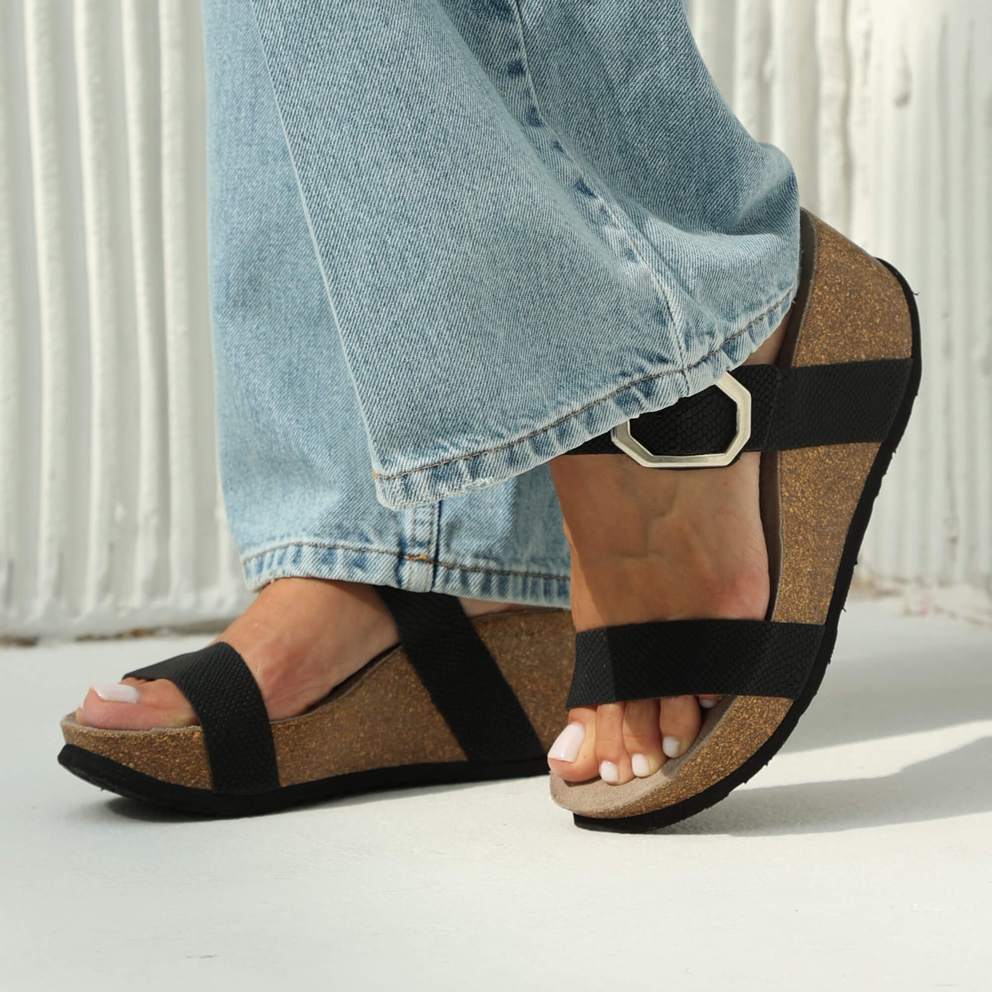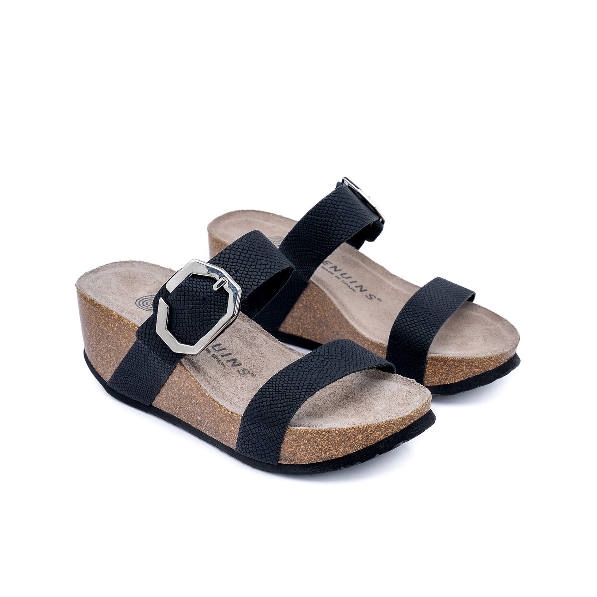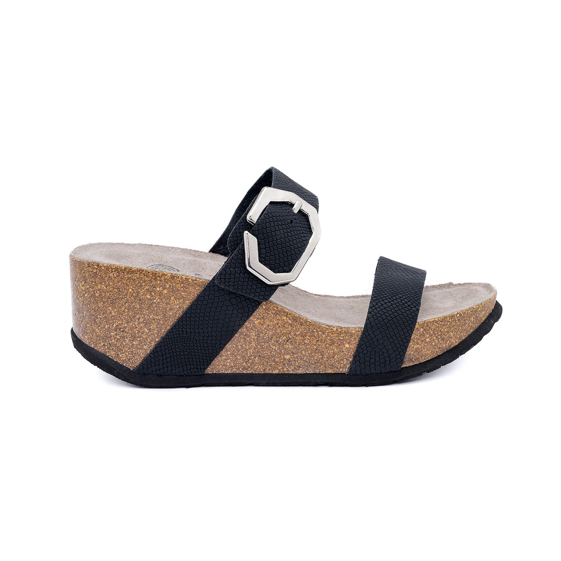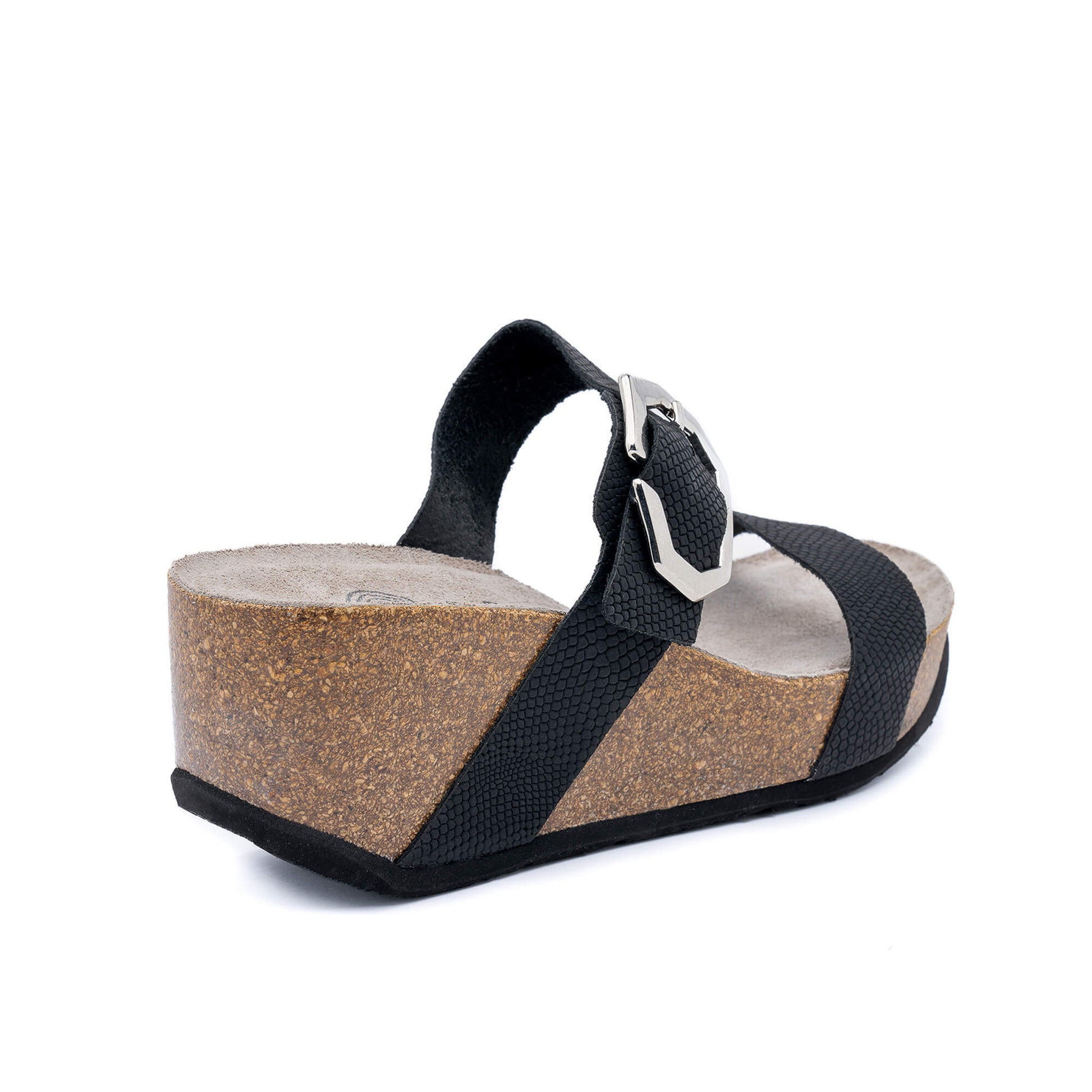 Experience the ultimate comfort with the Mont Anthracite Sandal. Its synthetic material wedge is 7cm tall for a height boost, and it features an anatomical cork plant for a cushioned, soft feel. The adjustable buckle strap ensures a perfect fit, and an EVA outsole provides superior traction. Expertly crafted in Spain with luxurious materials.