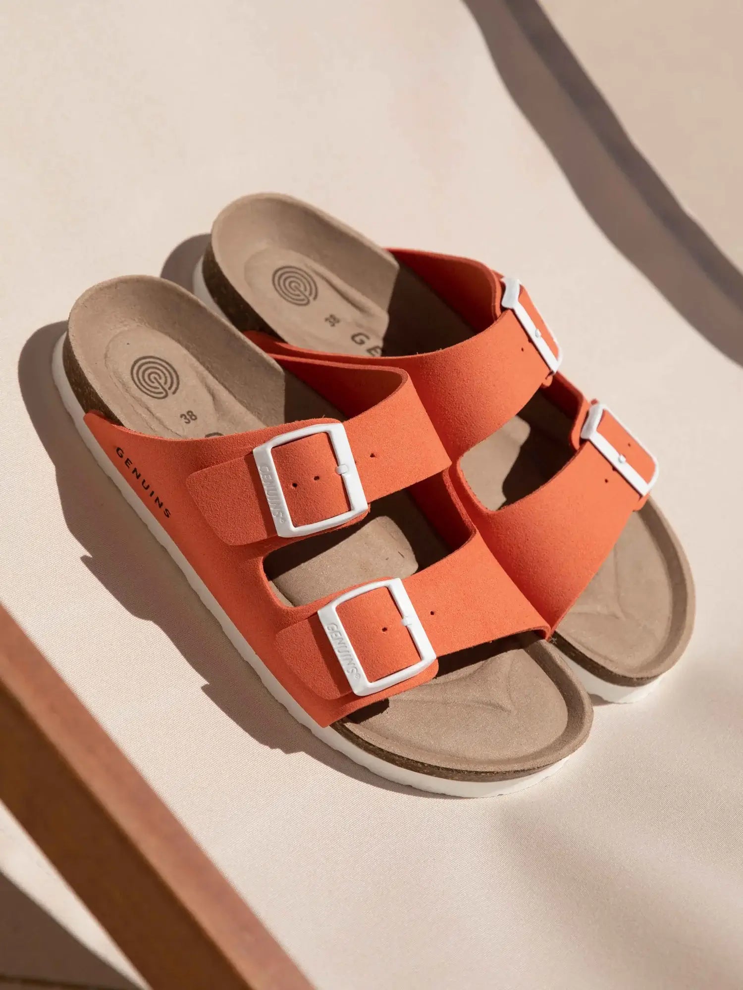 Sandal with adjustable buckles. Anatomical footbed made from cork and foam. Vegan footwear approved by PETA, animal-free, and environmentally friendly.
