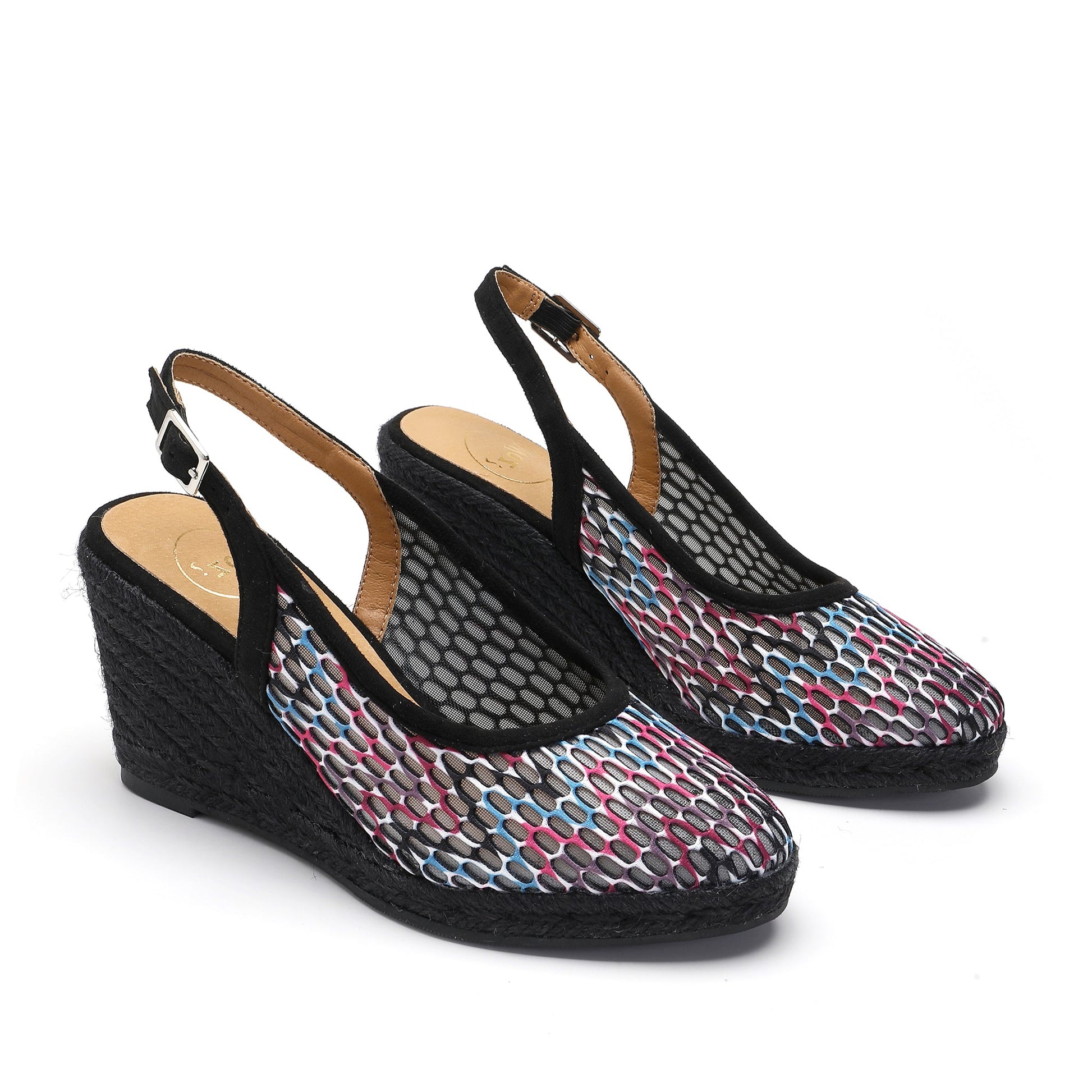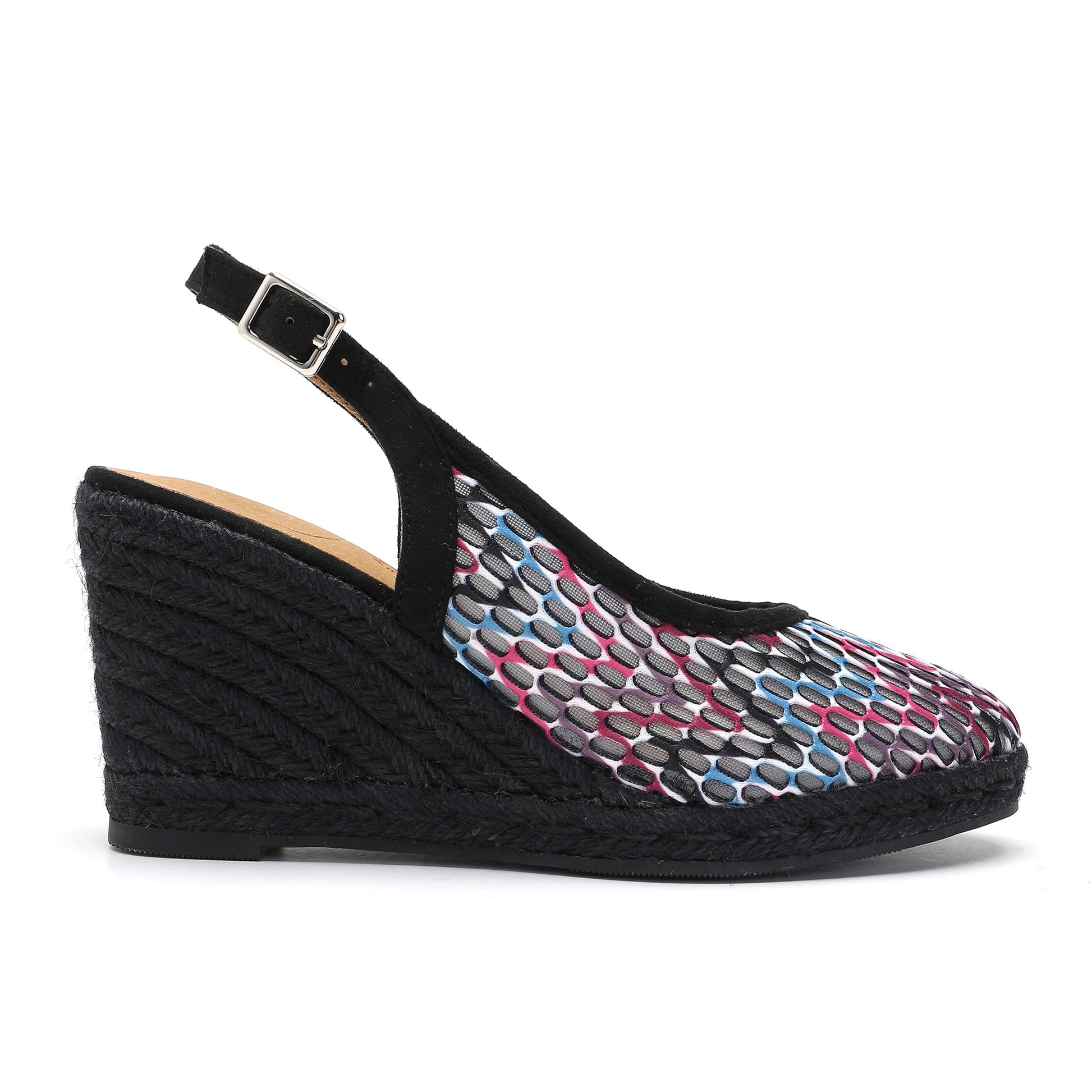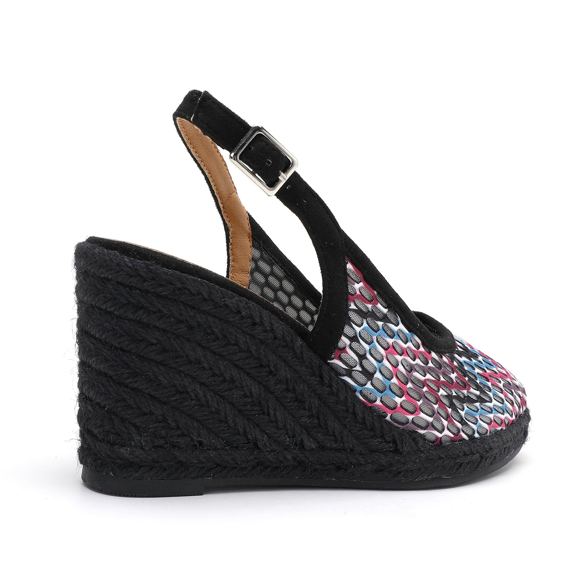 Crafted from delicate mesh, these stunning espadrille feature a soft padded footbed and a buckle adjustable ankle strap for maximum comfort. The heel stands at 7 cm and is covered in black braided jute, making them a stylish and durable choice. Designed in Italy by experts in the industry.